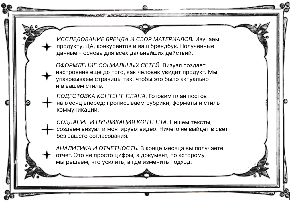 Поэтому важно не просто сделать идеальную картинку согласно трендам, а понять, чем живет ваша аудитория и создавать контент, который будет узнаваемым и понятным именно для неё. В рамках сотрудничества мы берем на себя весь цикл: