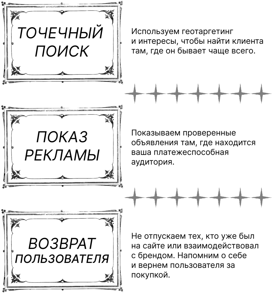Когда мы знаем портрет пользователя, в дело вступает таргет. Мы находим аудиторию на крупнейших интернет-площадках России: ВКонтакте, Одноклассники, Телеграм, Макс, ВК Видео, а также на сайтах и сервисах экосистемы VK и Mail.ru Group.
